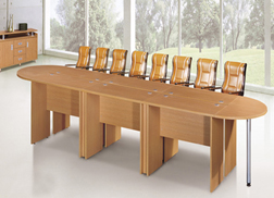 Oval shaped, pressure laminated wooden top and steel supports, comprising of 2 semicircular parts and two longish rectangular parts, 4 corners which are combined to form one unit, designed with void in the meeting for planters, good, heavy duty and affordable quality to accommodate 10-14 people.